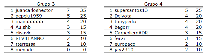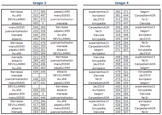 Deja un comentarioEn está página se irán indicando los resultados de las diferentes partidas. Lo único que tienes que hacer es insertar un comentario en la parte inferior de la pantalla (“Deja tu comentario”) indicando el nombre de los dos usuarios y los puntos obtenidos por ambos en la partida. El vencedor de cada partida será el encargado de comunicar el resultado en este apartado.