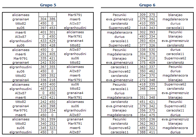 Deja un comentarioEn está página se irán indicando los resultados de las diferentes partidas. Lo único que tienes que hacer es insertar un comentario en la parte inferior de la pantalla (“Deja tu comentario”) indicando el nombre de los dos usuarios y los puntos obtenidos por ambos en la partida. El vencedor de cada partida será el encargado de comunicar el resultado en este apartado.