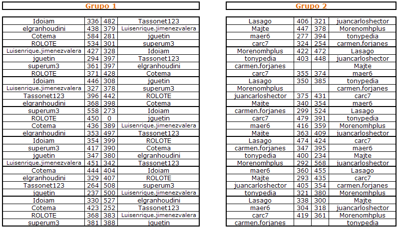 Deja un comentarioEn está página se irán indicando los resultados de las diferentes partidas. Lo único que tienes que hacer es insertar un comentario en la parte inferior de la pantalla (“Deja tu comentario”) indicando el nombre de los dos usuarios y los puntos obtenidos por ambos en la partida. El vencedor de cada partida será el encargado de comunicar el resultado en este apartado.