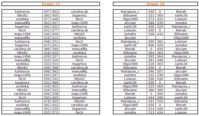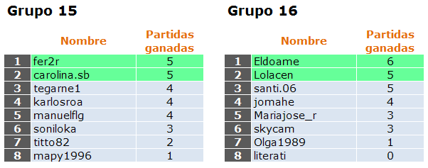 Deja un comentarioEn está página se irán indicando los resultados de las diferentes partidas. Lo único que tienes que hacer es insertar un comentario en la parte inferior de la pantalla (“Deja tu comentario”) indicando el nombre de los dos usuarios y los puntos obtenidos por ambos en la partida. El vencedor de cada partida será el encargado de comunicar el resultado en este apartado.