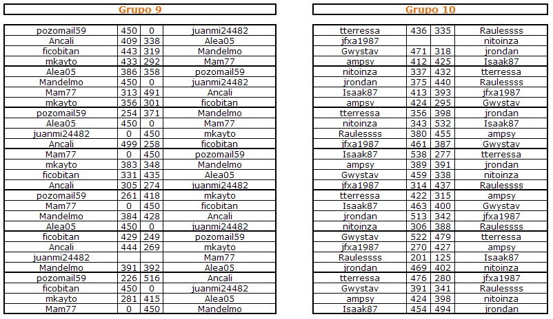 Deja un comentarioEn está página se irán indicando los resultados de las diferentes partidas. Lo único que tienes que hacer es insertar un comentario en la parte inferior de la pantalla (“Deja tu comentario”) indicando el nombre de los dos usuarios y los puntos obtenidos por ambos en la partida. El vencedor de cada partida será el encargado de comunicar el resultado en este apartado.