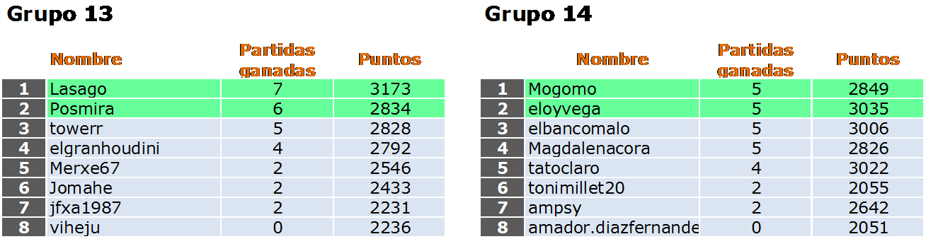 Deja un comentarioEn está página se irán indicando los resultados de las diferentes partidas. Lo único que tienes que hacer es insertar un comentario en la parte inferior de la pantalla (“Deja tu comentario”) indicando el nombre de los dos usuarios y los puntos obtenidos por ambos en la partida. El vencedor de cada partida será el encargado de comunicar el resultado en este apartado.