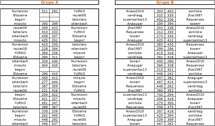 Deja un comentarioEn está página se irán indicando los resultados de las diferentes partidas. Lo único que tienes que hacer es insertar un comentario en la parte inferior de la pantalla (“Deja tu comentario”) indicando el nombre de los dos usuarios y los puntos obtenidos por ambos en la partida. El vencedor de cada partida será el encargado de comunicar el resultado en este apartado.