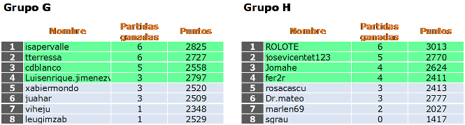 Deja un comentarioEn está página se irán indicando los resultados de las diferentes partidas. Lo único que tienes que hacer es insertar un comentario en la parte inferior de la pantalla (“Deja tu comentario”) indicando el nombre de los dos usuarios y los puntos obtenidos por ambos en la partida. El vencedor de cada partida será el encargado de comunicar el resultado en este apartado.
