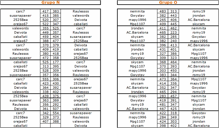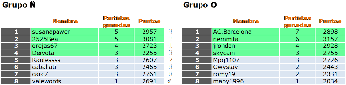 Deja un comentarioEn está página se irán indicando los resultados de las diferentes partidas. Lo único que tienes que hacer es insertar un comentario en la parte inferior de la pantalla (“Deja tu comentario”) indicando el nombre de los dos usuarios y los puntos obtenidos por ambos en la partida. El vencedor de cada partida será el encargado de comunicar el resultado en este apartado.