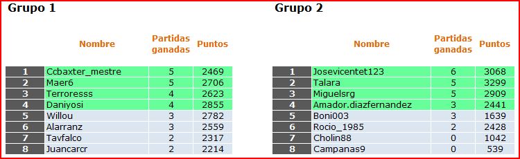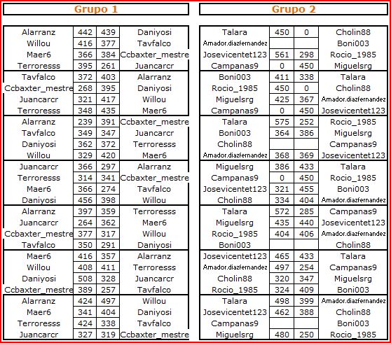 Deja un comentarioEn está página se irán publicando los resultados de las diferentes partidas, siendo ambos jugadores los responsables de subirlos, o comprobando que ya hayan sido subidos, insertando un COMENTARIO en la parte inferior de la pantalla (opción «Deja tu comentario«), indicando el nombre de los dos jugadores y los puntos obtenidos en la partida.