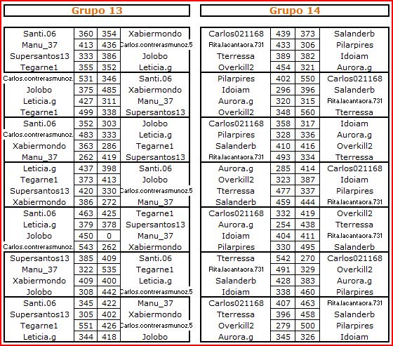 Deja un comentarioEn está página se irán publicando los resultados de las diferentes partidas, siendo ambos jugadores los responsables de subirlos, o comprobando que ya hayan sido subidos, insertando un COMENTARIO en la parte inferior de la pantalla (opción «Deja tu comentario«), indicando el nombre de los dos jugadores y los puntos obtenidos en la partida.