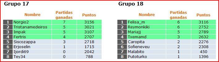 Deja un comentarioEn está página se irán publicando los resultados de las diferentes partidas, siendo ambos jugadores los responsables de subirlos, o comprobando que ya hayan sido subidos, insertando un COMENTARIO en la parte inferior de la pantalla (opción «Deja tu comentario«), indicando el nombre de los dos jugadores y los puntos obtenidos en la partida.