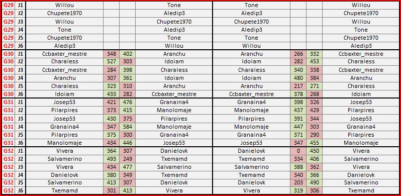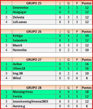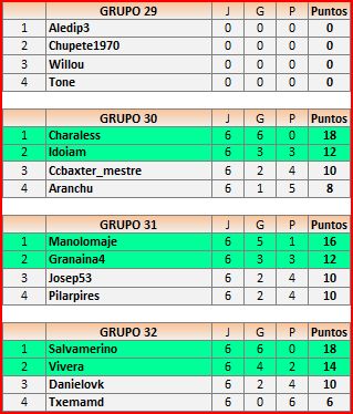 Los integrantes del grupo 29 quedan descalificados al no haber subido ningún resultado. Sus plazas, quedarán cubiertas por los dos mejores terceros (Josep42-Peluquicoco)