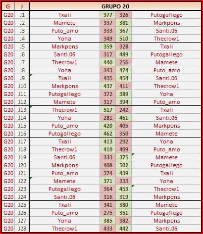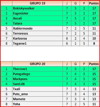 Deja un comentarioEn está página se irán publicando los resultados de las diferentes partidas, siendo ambos jugadores los responsables de subirlos, o comprobando que ya hayan sido subidos, insertando un COMENTARIO en la parte inferior de la pantalla (opción «Deja tu comentario«), indicando el nombre de los dos jugadores y los puntos obtenidos en la partida.
