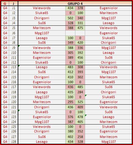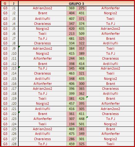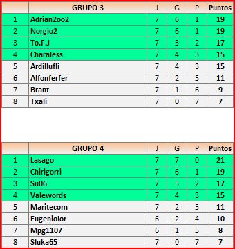 Deja un comentarioEn está página se irán publicando los resultados de las diferentes partidas, siendo ambos jugadores los responsables de subirlos, o comprobando que ya hayan sido subidos, insertando un COMENTARIO en la parte inferior de la pantalla (opción «Deja tu comentario«), indicando el nombre de los dos jugadores y los puntos obtenidos en la partida.