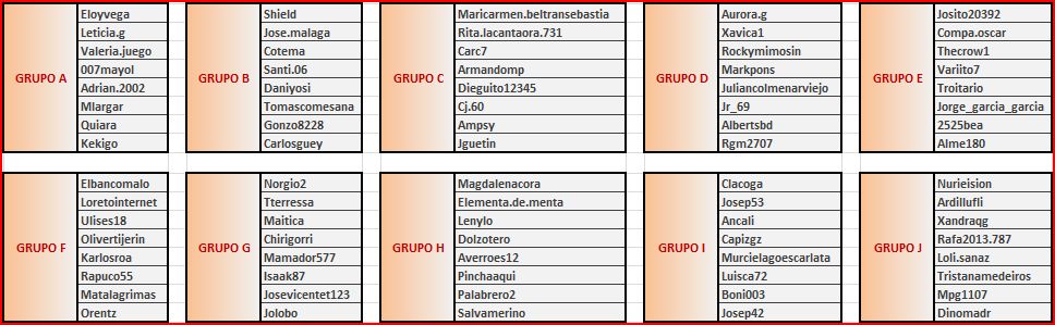 ¡¡¡ En esta página NO SE PUBLICAN RESULTADOS !!! ¡¡¡ Hazlo en la sub-página habilitada para el grupo en el que estés encuadrado !!! Desde 01/01/2014, las reglas de todos los torneos figuran en una pestaña general, no olvides leerlas.