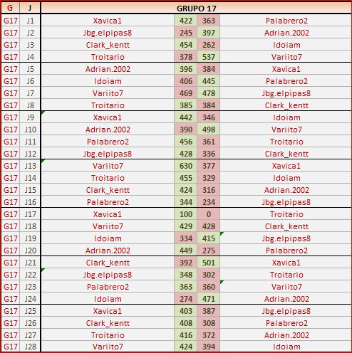 Deja un comentarioEn está página se irán publicando los resultados de las diferentes partidas, siendo ambos jugadores los responsables de subirlos, o comprobando que ya hayan sido subidos, insertando un COMENTARIO en la parte inferior de la pantalla (opción «Deja tu comentario«), indicando el nombre de los dos jugadores y los puntos obtenidos en la partida.