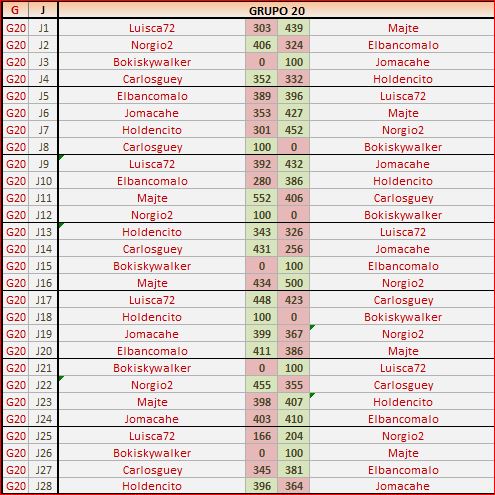 Deja un comentarioEn está página se irán publicando los resultados de las diferentes partidas, siendo ambos jugadores los responsables de subirlos, o comprobando que ya hayan sido subidos, insertando un COMENTARIO en la parte inferior de la pantalla (opción «Deja tu comentario«), indicando el nombre de los dos jugadores y los puntos obtenidos en la partida.