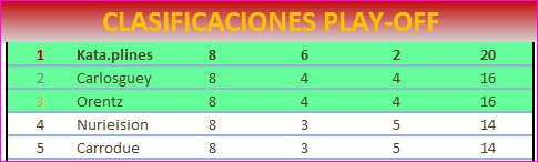 Enhorabuena, Kata. Justa vencedora de este playoff tan igualado. Me ha encantado llegar a una nueva final después de tanto tiempo. Y encontrarme aquí especialmente a mi compañera, mi amiga y mi reina Nurieision. No me importa haber quedado el último porque también ha sido un honor jugar con esos nuevos (para mí) y magníficos rivales que son Carlosguey y Orentz. Ya se sabe la frase: «Unas veces se gana y otras se aprende». Un abrazo a todos y hasta la próxima.