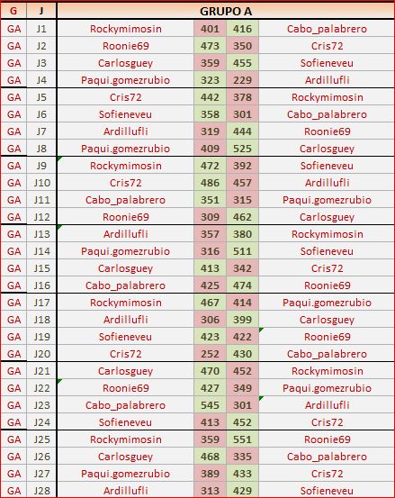 Deja un comentarioEn está página se irán publicando los resultados de las diferentes partidas, siendo ambos jugadores los responsables de subirlos, o comprobando que ya hayan sido subidos, insertando un COMENTARIO en la parte inferior de la pantalla (opción «Deja tu comentario«), indicando el nombre de los dos jugadores y los puntos obtenidos en la partida.