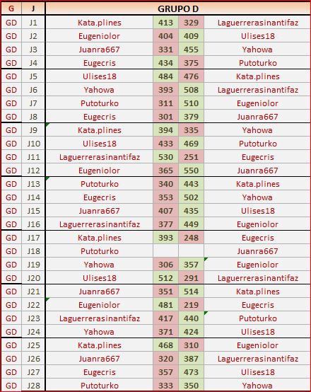 Deja un comentarioEn está página se irán publicando los resultados de las diferentes partidas, siendo ambos jugadores los responsables de subirlos, o comprobando que ya hayan sido subidos, insertando un COMENTARIO en la parte inferior de la pantalla (opción «Deja tu comentario«), indicando el nombre de los dos jugadores y los puntos obtenidos en la partida.