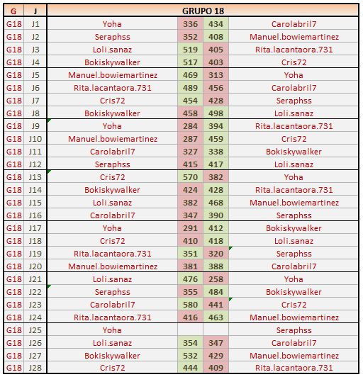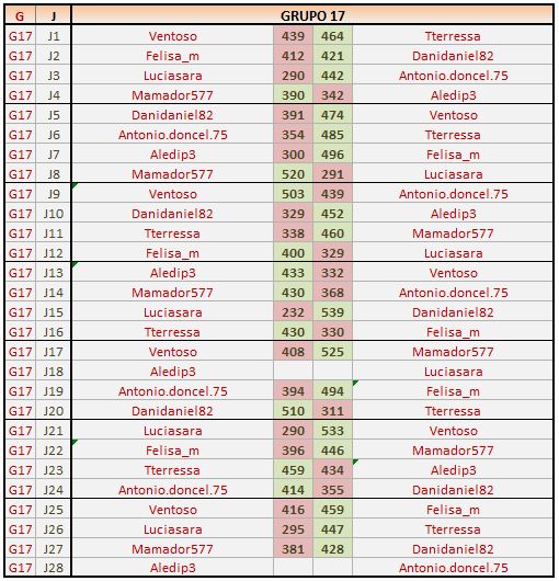 Deja un comentarioEn está página se irán publicando los resultados de las diferentes partidas, siendo ambos jugadores los responsables de subirlos, o comprobando que ya hayan sido subidos, insertando un COMENTARIO en la parte inferior de la pantalla (opción «Deja tu comentario«), indicando el nombre de los dos jugadores y los puntos obtenidos en la partida.