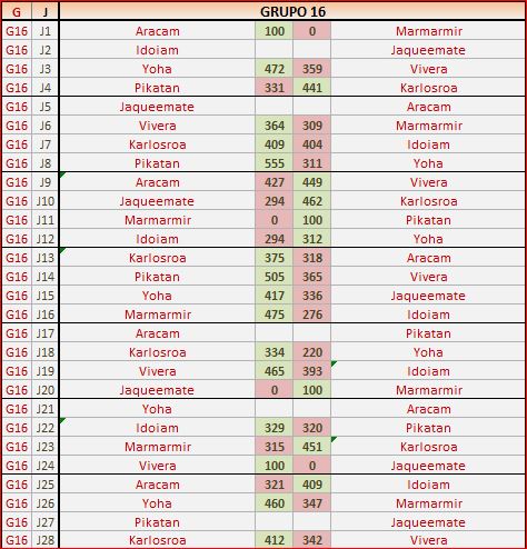 Deja un comentarioEn está página se irán publicando los resultados de las diferentes partidas, siendo ambos jugadores los responsables de subirlos, o comprobando que ya hayan sido subidos, insertando un COMENTARIO en la parte inferior de la pantalla (opción «Deja tu comentario«), indicando el nombre de los dos jugadores y los puntos obtenidos en la partida.