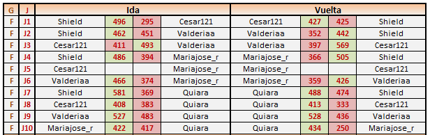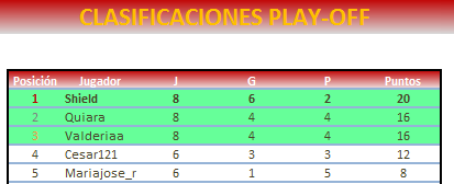 Felicitar a esos grandes finalistas Valderiaa….esta cerquita tu torneo..se intuye…Quiara…que gran torneo has hecho, has dado una leccion a mas de uno por el camino y seguro que has disfrutado llegar a tu 1er play off y con opciones hasta el final…M_Jose y Cesar su 1er play off..Enhorabuena a todos nuevamente.