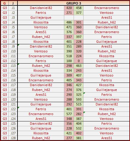 Deja un comentarioEn está página se irán publicando los resultados de las diferentes partidas, siendo ambos jugadores los responsables de subirlos, o comprobando que ya hayan sido subidos, insertando un COMENTARIO en la parte inferior de la pantalla (opción «Deja tu comentario«), indicando el nombre de los dos jugadores y los puntos obtenidos en la partida.