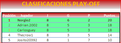 Confirmo los otros 2 y a pesar del desastroso playoff estoy orgulloso de llegar hasta aquí que está muy caro. Enhorabuena al campeón y a los demás participante, sois todos estupendos. Un placer jugar con vosotros. Gracias a la organización por todo lo que hace y felic e se fiestas.