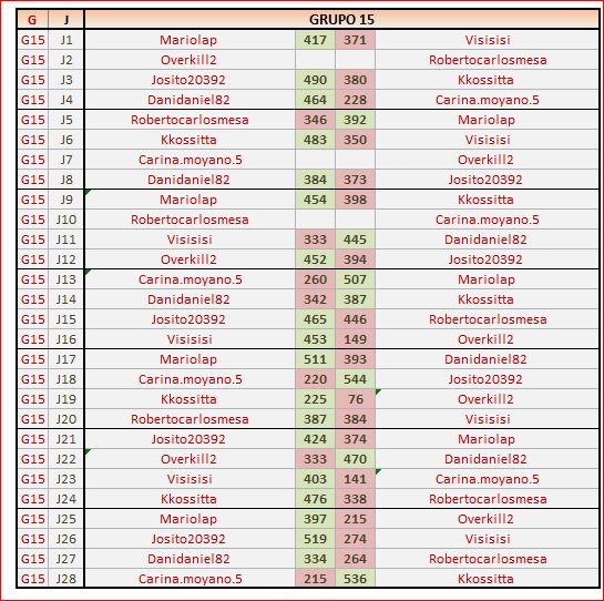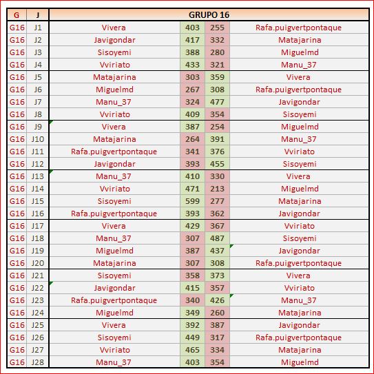 Deja un comentarioEn está página se irán publicando los resultados de las diferentes partidas, siendo ambos jugadores los responsables de subirlos, o comprobando que ya hayan sido subidos, insertando un COMENTARIO en la parte inferior de la pantalla (opción «Deja tu comentario«), indicando el nombre de los dos jugadores y los puntos obtenidos en la partida.