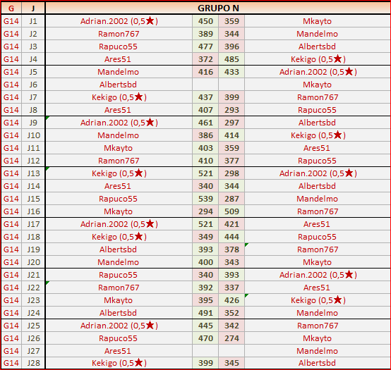 Deja un comentarioEn está página se irán publicando los resultados de las diferentes partidas, siendo ambos jugadores los responsables de subirlos, o comprobando que ya hayan sido subidos, insertando un COMENTARIO en la parte inferior de la pantalla (opción «Deja tu comentario»), indicando el nombre de los dos jugadores y los puntos obtenidos en la partida.