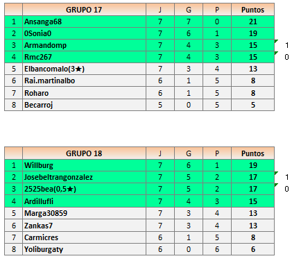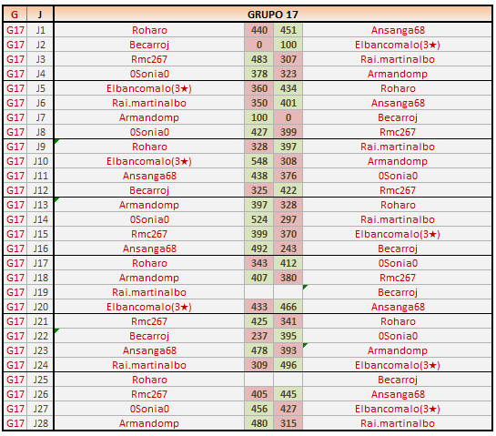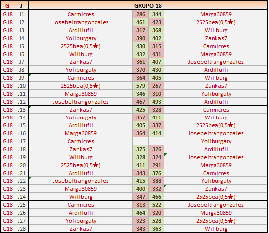 Deja un comentarioEn está página se irán publicando los resultados de las diferentes partidas, siendo ambos jugadores los responsables de subirlos, o comprobando que ya hayan sido subidos, insertando un COMENTARIO en la parte inferior de la pantalla (opción «Deja tu comentario»), indicando el nombre de los dos jugadores y los puntos obtenidos en la partida.