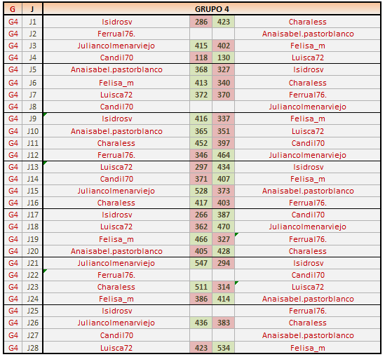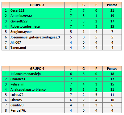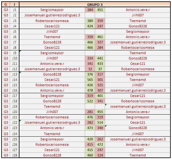 Deja un comentarioEn está página se irán publicando los resultados de las diferentes partidas, siendo ambos jugadores los responsables de subirlos, o comprobando que ya hayan sido subidos, insertando un COMENTARIO en la parte inferior de la pantalla (opción «Deja tu comentario»), indicando el nombre de los dos jugadores y los puntos obtenidos en la partida.
