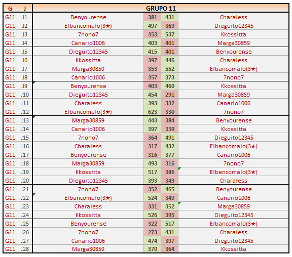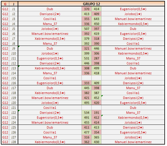 Deja un comentarioEn está página se irán publicando los resultados de las diferentes partidas, siendo ambos jugadores los responsables de subirlos, o comprobando que ya hayan sido subidos, insertando un COMENTARIO en la parte inferior de la pantalla (opción “Deja tu comentario”), indicando el nombre de los dos jugadores y los puntos obtenidos en la partida.