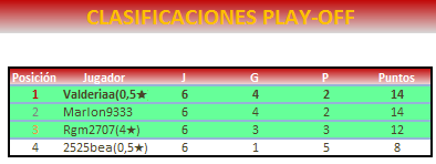 Muchas felicidades a super valderia y mención especial a Marlon 1 negro con media estrellita jajaja mi enhorabuena a Ramon por el 3 puesto y un besazo a Bea que vaya mierda de play off que te marcas te jajaja esto me dijo José que lo pusiera jajajaja es broma un beso a todos a ti no Marlon jajajaja
