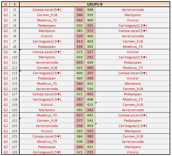 Deja un comentarioEn está página se irán publicando los resultados de las diferentes partidas, siendo ambos jugadores los responsables de subirlos, o comprobando que ya hayan sido subidos, insertando un COMENTARIO en la parte inferior de la pantalla (opción “Deja tu comentario“), indicando el nombre de los dos jugadores y los puntos obtenidos en la partida.