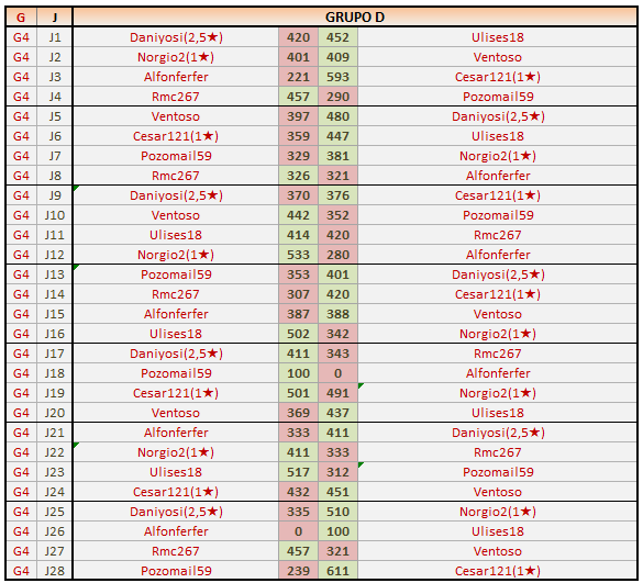 Deja un comentarioEn está página se irán publicando los resultados de las diferentes partidas, siendo ambos jugadores los responsables de subirlos, o comprobando que ya hayan sido subidos, insertando un COMENTARIO en la parte inferior de la pantalla (opción “Deja tu comentario“), indicando el nombre de los dos jugadores y los puntos obtenidos en la partida.