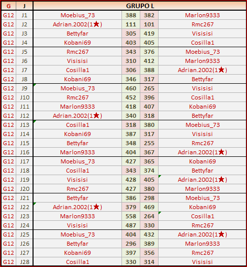 Deja un comentarioEn está página se irán publicando los resultados de las diferentes partidas, siendo ambos jugadores los responsables de subirlos, o comprobando que ya hayan sido subidos, insertando un COMENTARIO en la parte inferior de la pantalla (opción “Deja tu comentario“), indicando el nombre de los dos jugadores y los puntos obtenidos en la partida.
