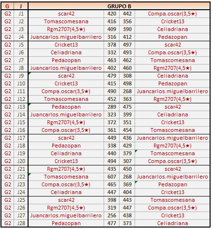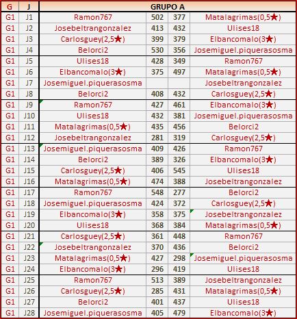 Deja un comentarioEn está página se irán publicando los resultados de las diferentes partidas, siendo ambos jugadores los responsables de subirlos, o comprobando que ya hayan sido subidos, insertando un COMENTARIO en la parte inferior de la pantalla (opción “Deja tu comentario“), indicando el nombre de los dos jugadores y los puntos obtenidos en la partida.