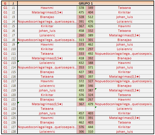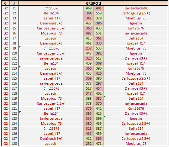 Deja un comentarioEn está página se irán publicando los resultados de las diferentes partidas, siendo ambos jugadores los responsables de subirlos, o comprobando que ya hayan sido subidos, insertando un COMENTARIO en la parte inferior de la pantalla (opción “Deja tu comentario“), indicando el nombre de los dos jugadores y los puntos obtenidos en la partida.