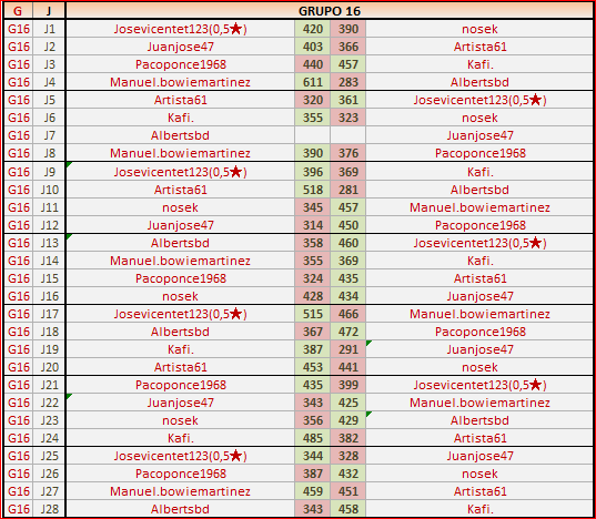Deja un comentarioEn está página se irán publicando los resultados de las diferentes partidas, siendo ambos jugadores los responsables de subirlos, o comprobando que ya hayan sido subidos, insertando un COMENTARIO en la parte inferior de la pantalla (opción “Deja tu comentario“), indicando el nombre de los dos jugadores y los puntos obtenidos en la partida.