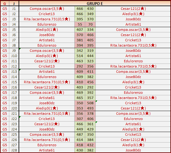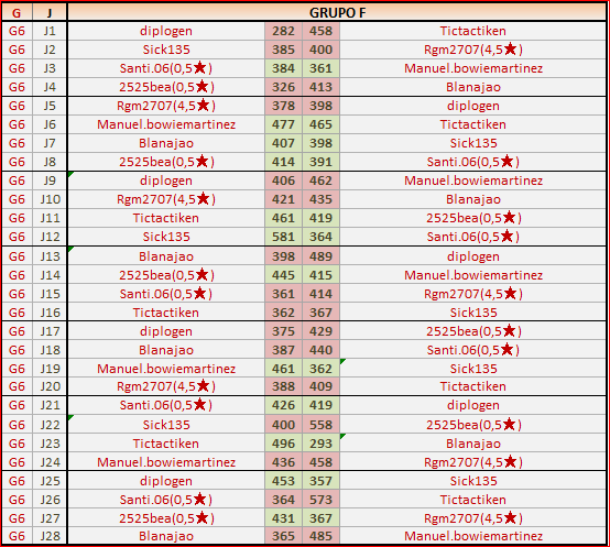Deja un comentarioEn está página se irán publicando los resultados de las diferentes partidas, siendo ambos jugadores los responsables de subirlos, o comprobando que ya hayan sido subidos, insertando un COMENTARIO en la parte inferior de la pantalla (opción “Deja tu comentario“), indicando el nombre de los dos jugadores y los puntos obtenidos en la partida.