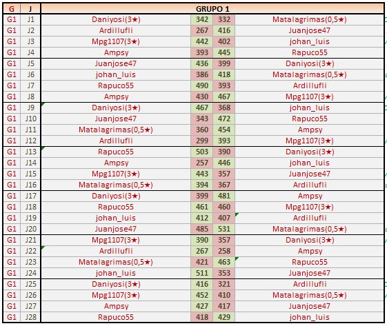 Deja un comentarioEn está página se irán publicando los resultados de las diferentes partidas, siendo ambos jugadores los responsables de subirlos, o comprobando que ya hayan sido subidos, insertando un COMENTARIO en la parte inferior de la pantalla (opción “Deja tu comentario“), indicando el nombre de los dos jugadores y los puntos obtenidos en la partida.