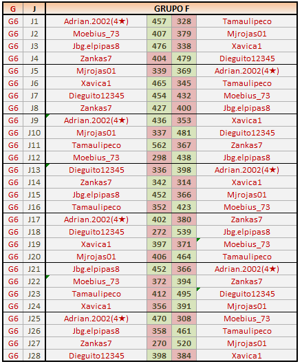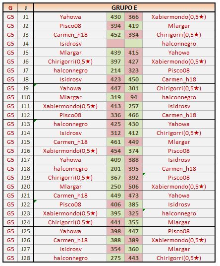 Deja un comentarioEn está página se irán publicando los resultados de las diferentes partidas, siendo ambos jugadores los responsables de subirlos, o comprobando que ya hayan sido subidos, insertando un COMENTARIO en la parte inferior de la pantalla (opción “Deja tu comentario“), indicando el nombre de los dos jugadores y los puntos obtenidos en la partida.