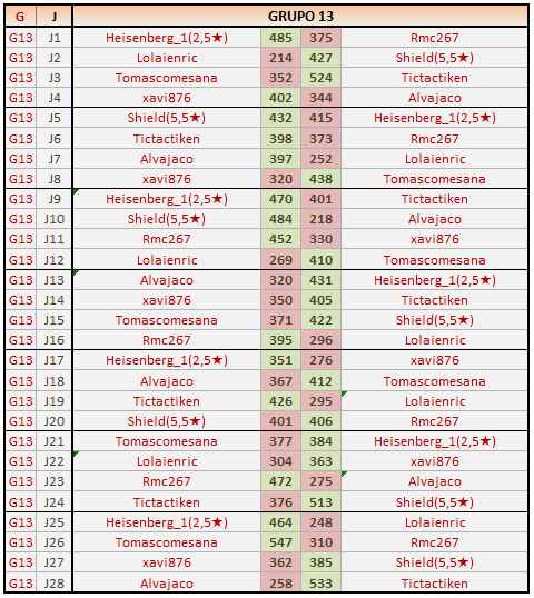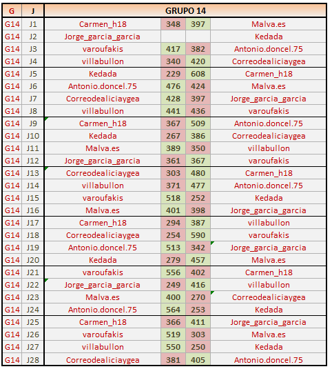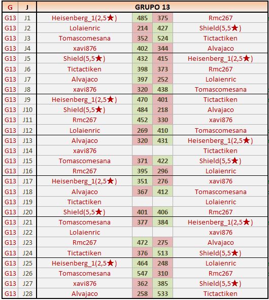 Deja un comentarioEn está página se irán publicando los resultados de las diferentes partidas, siendo ambos jugadores los responsables de subirlos, o comprobando que ya hayan sido subidos, insertando un COMENTARIO en la parte inferior de la pantalla (opción “Deja tu comentario“), indicando el nombre de los dos jugadores y los puntos obtenidos en la partida.