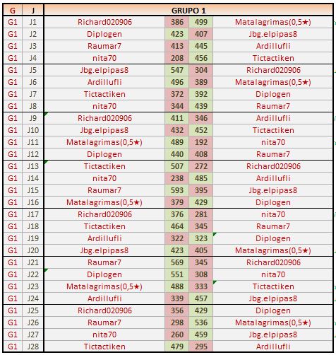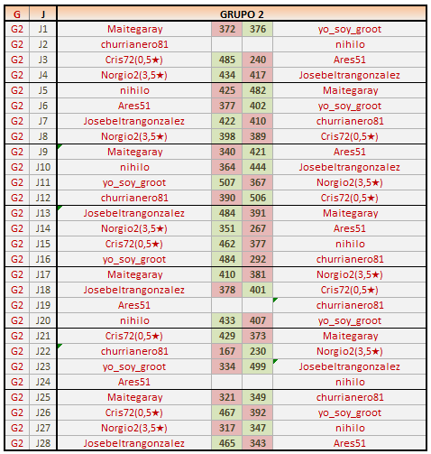Deja un comentarioEn está página se irán publicando los resultados de las diferentes partidas, siendo ambos jugadores los responsables de subirlos, o comprobando que ya hayan sido subidos, insertando un COMENTARIO en la parte inferior de la pantalla (opción “Deja tu comentario“), indicando el nombre de los dos jugadores y los puntos obtenidos en la partida.