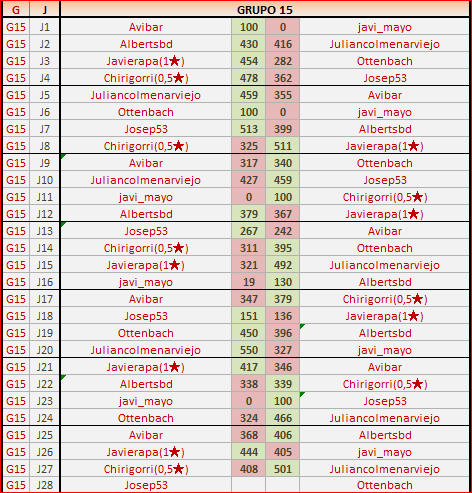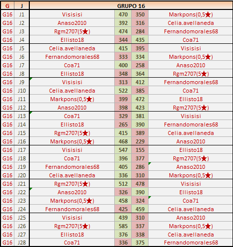 Deja un comentarioEn está página se irán publicando los resultados de las diferentes partidas, siendo ambos jugadores los responsables de subirlos, o comprobando que ya hayan sido subidos, insertando un COMENTARIO en la parte inferior de la pantalla (opción “Deja tu comentario“), indicando el nombre de los dos jugadores y los puntos obtenidos en la partida.