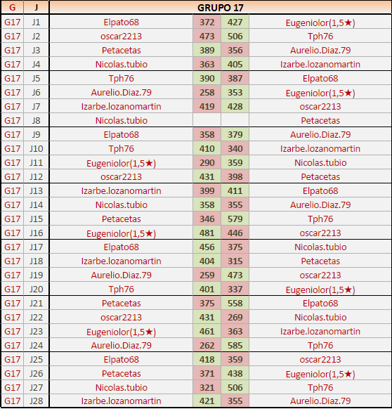 Deja un comentarioEn está página se irán publicando los resultados de las diferentes partidas, siendo ambos jugadores los responsables de subirlos, o comprobando que ya hayan sido subidos, insertando un COMENTARIO en la parte inferior de la pantalla (opción “Deja tu comentario“), indicando el nombre de los dos jugadores y los puntos obtenidos en la partida.