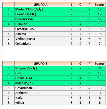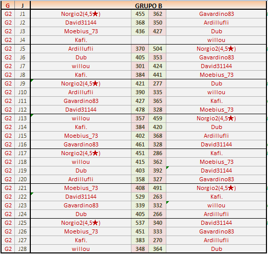 Deja un comentarioEn está página se irán publicando los resultados de las diferentes partidas, siendo ambos jugadores los responsables de subirlos, o comprobando que ya hayan sido subidos, insertando un COMENTARIO en la parte inferior de la pantalla (opción “Deja tu comentario“), indicando el nombre de los dos jugadores y los puntos obtenidos en la partida.