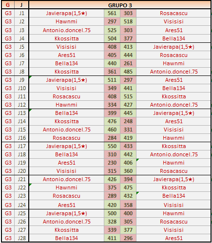 Deja un comentarioEn está página se irán publicando los resultados de las diferentes partidas, siendo ambos jugadores los responsables de subirlos, o comprobando que ya hayan sido subidos, insertando un COMENTARIO en la parte inferior de la pantalla (opción “Deja tu comentario“), indicando el nombre de los dos jugadores y los puntos obtenidos en la partida.