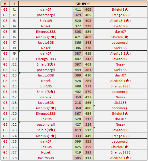 Deja un comentarioEn está página se irán publicando los resultados de las diferentes partidas, siendo ambos jugadores los responsables de subirlos, o comprobando que ya hayan sido subidos, insertando un COMENTARIO en la parte inferior de la pantalla (opción “Deja tu comentario“), indicando el nombre de los dos jugadores y los puntos obtenidos en la partida.