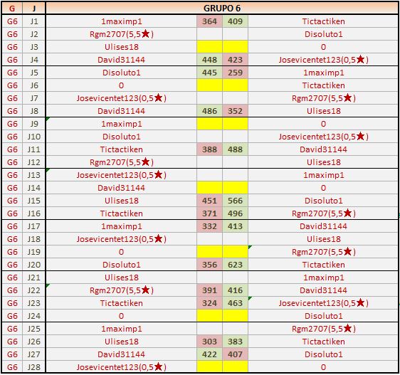 Deja un comentarioEn está página se irán publicando los resultados de las diferentes partidas, siendo ambos jugadores responsables de subirlos o de comprobar que ya hayan sido publicados, insertando un COMENTARIO en la parte inferior de la pantalla (opción “Deja tu comentario”), indicando el nombre de los dos jugadores y los puntos obtenidos en la partida.