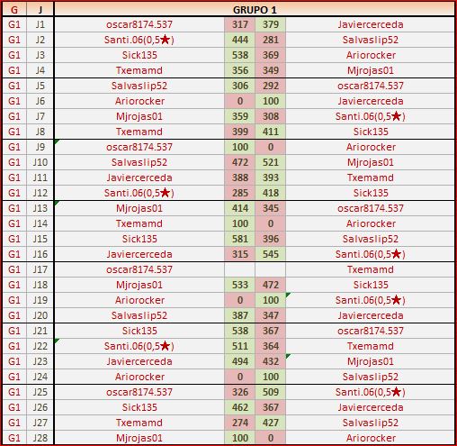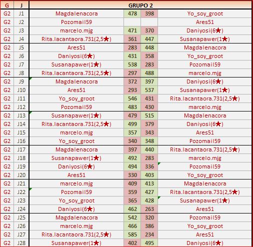 Deja un comentarioEn está página se irán publicando los resultados de las diferentes partidas, siendo ambos jugadores responsables de subirlos o de comprobar que ya hayan sido publicados, insertando un COMENTARIO en la parte inferior de la pantalla (opción “Deja tu comentario”), indicando el nombre de los dos jugadores y los puntos obtenidos en la partida.
